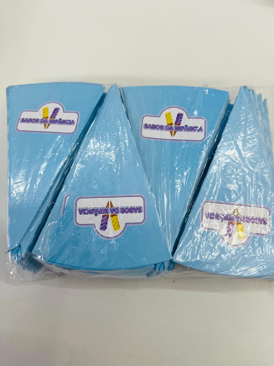 Cone para casquinha escrita Sabor da infância azul com 200 unidades